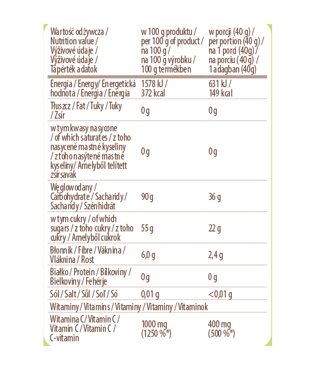 Składniki: cukier, maltodekstryna, błonnik [inulina (z cykorii)], witamina C, naturalny aromat ogórkowy (0,7%), aromaty, koncentrat soku z buraka w proszku, koncentrat czarnej marchwi w proszku, barwnik: karoteny. Produkt może zawierać mleko, soję i zboża zawierające gluten.