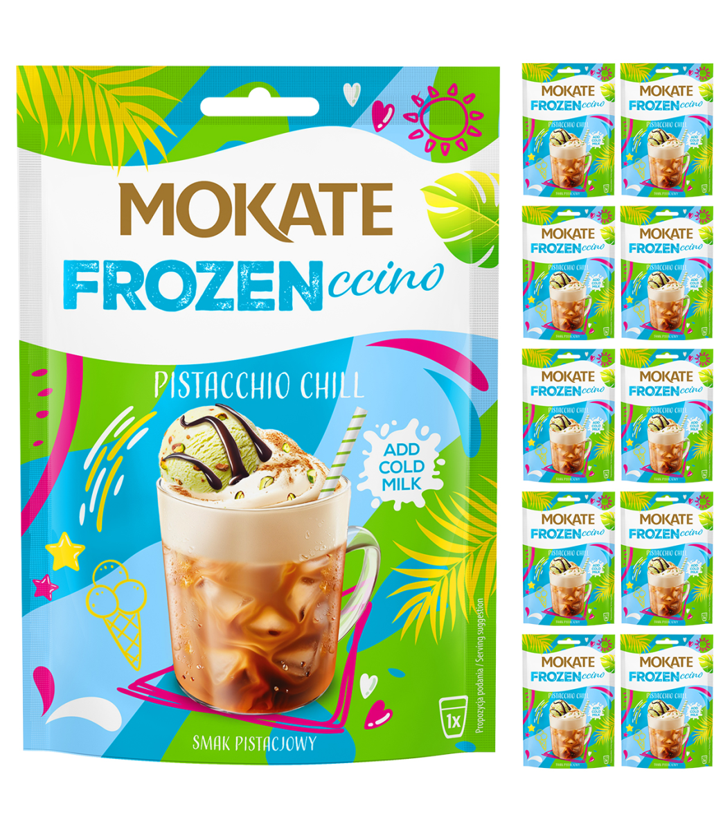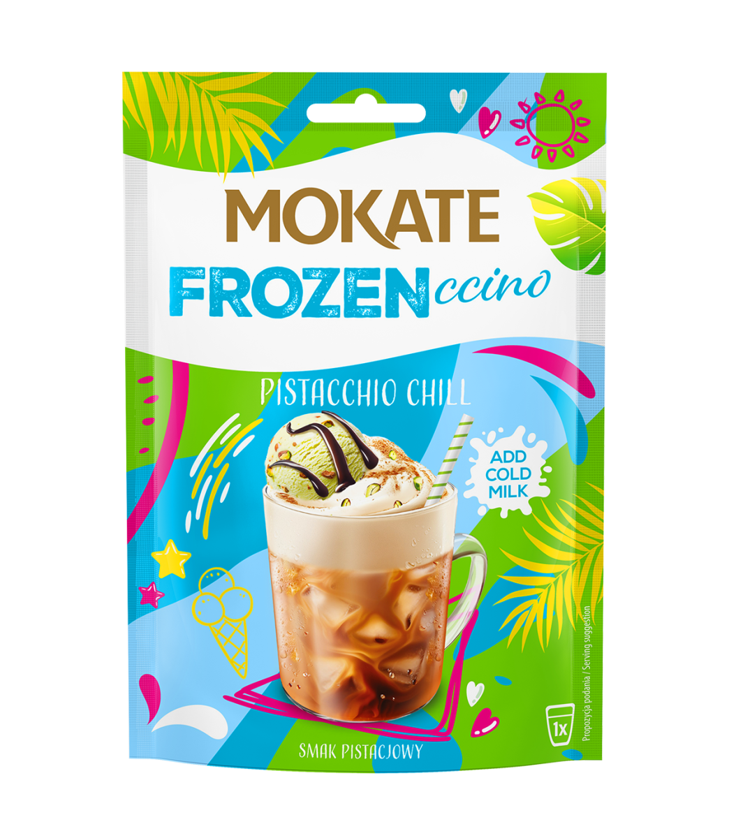 FROZENCCINO Pistacchio Chill to cappuccino na zimno inspirowane smakiem lodów pistacjowych. Delikatny, lekki aromat orzechów doskonale komponuje się z mocą kawy – to napój, dzięki któremu poczujesz się niczym w Neapolu czy Rzymie. Z Mokate FROZENCCINO wystarczy kilka chwil, aby zaznać chłodnej przyjemności. Po prostu rozpuść zawartość saszetki w zimnym mleku lub wodzie i gotowe! A jeśli masz ochotę zaskoczyć gości wyjątkowym deserem na zimno, dodaj np. bitą śmietanę, ulubione orzechy czy syrop. Eksperymentuj i znajdź idealną wersję.