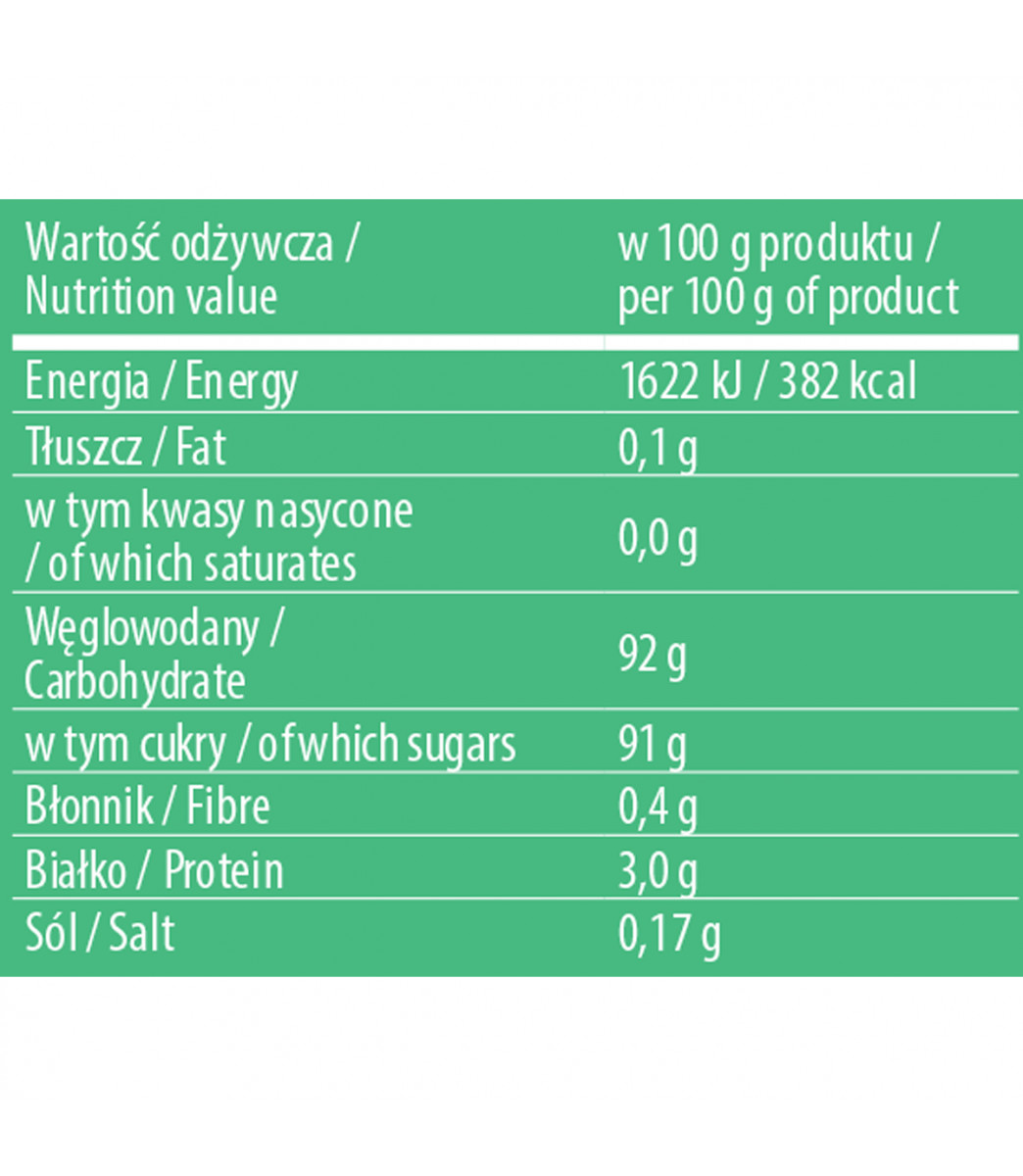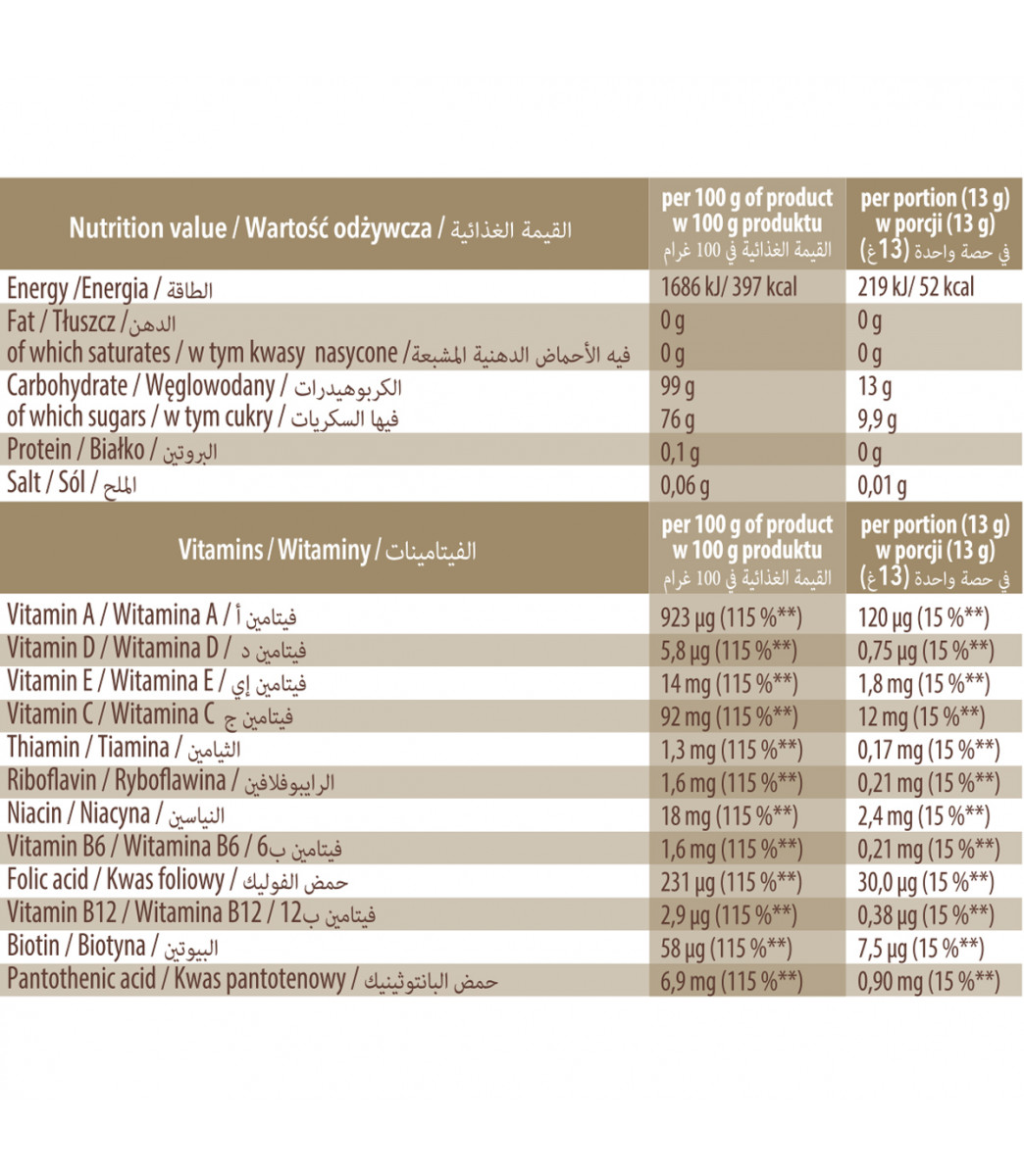Skład: cukier, kakao w proszku o obniżonej zawartości tłuszczu (23%), witamina C, niacyna, witamina E, kwas pantotenowy, witamina B2, witamina B6, witamina B1, witamina A, kwas foliowy, biotyna, witamina D, witamina B12, aromat naturalny, cynamon, emulgator: lecytyny (ze słonecznika), sól.