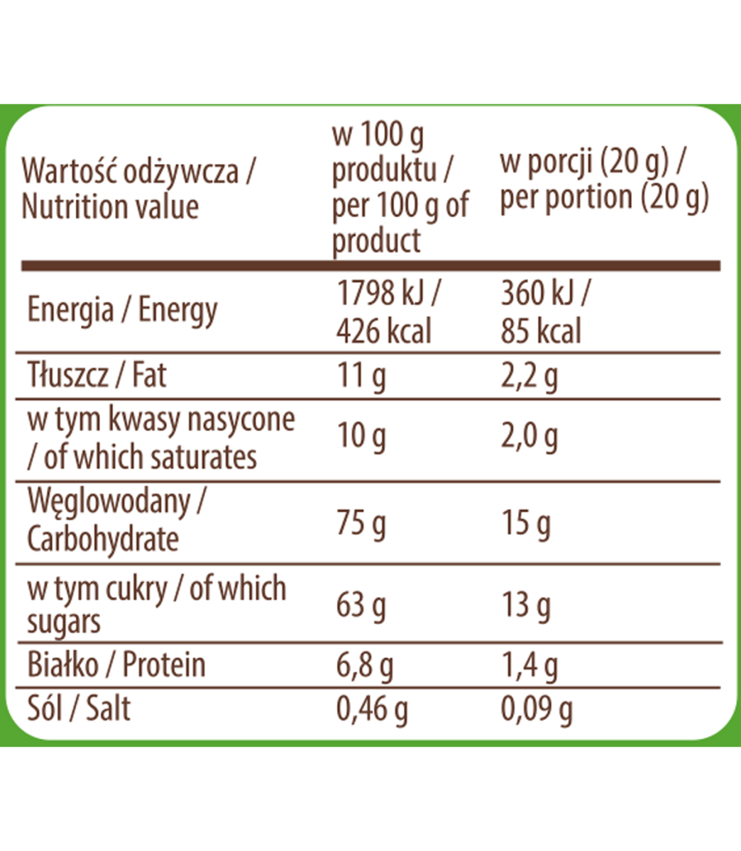 Składniki:permeat serwatkowy (z mleka), cukier, mleko w proszku odtłuszczone (18%), syrop glukozowy, olej kokosowy, zielona herbata Matcha (4%), stabilizator: fosforany potasu; aromat, zagęszczony sok wiśniowy w proszku (0,2%). Produkt może zawierać soję i zboża zawierające gluten.